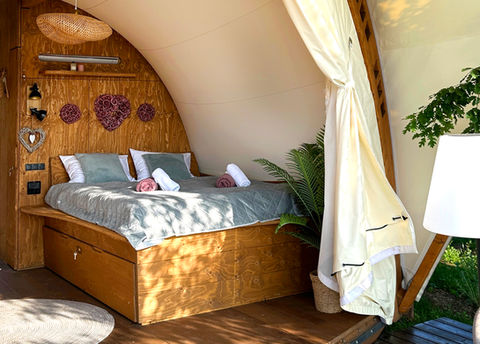 Our wooden glamping lodges blend naturally into the landscape, offering comfort while staying deeply connected to nature.